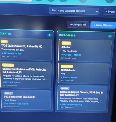 Their truck at SUN ’n FUN had the new large digital screens, showing their digital tech stack and the mission control board, the digital-assignment board and a third board showing exactly where every helicopter is working in the disaster zone. The pilot can also take photographs to that can upload to the system so headquarters can see the issue, such as roads blocked by downed trees after a major storm.